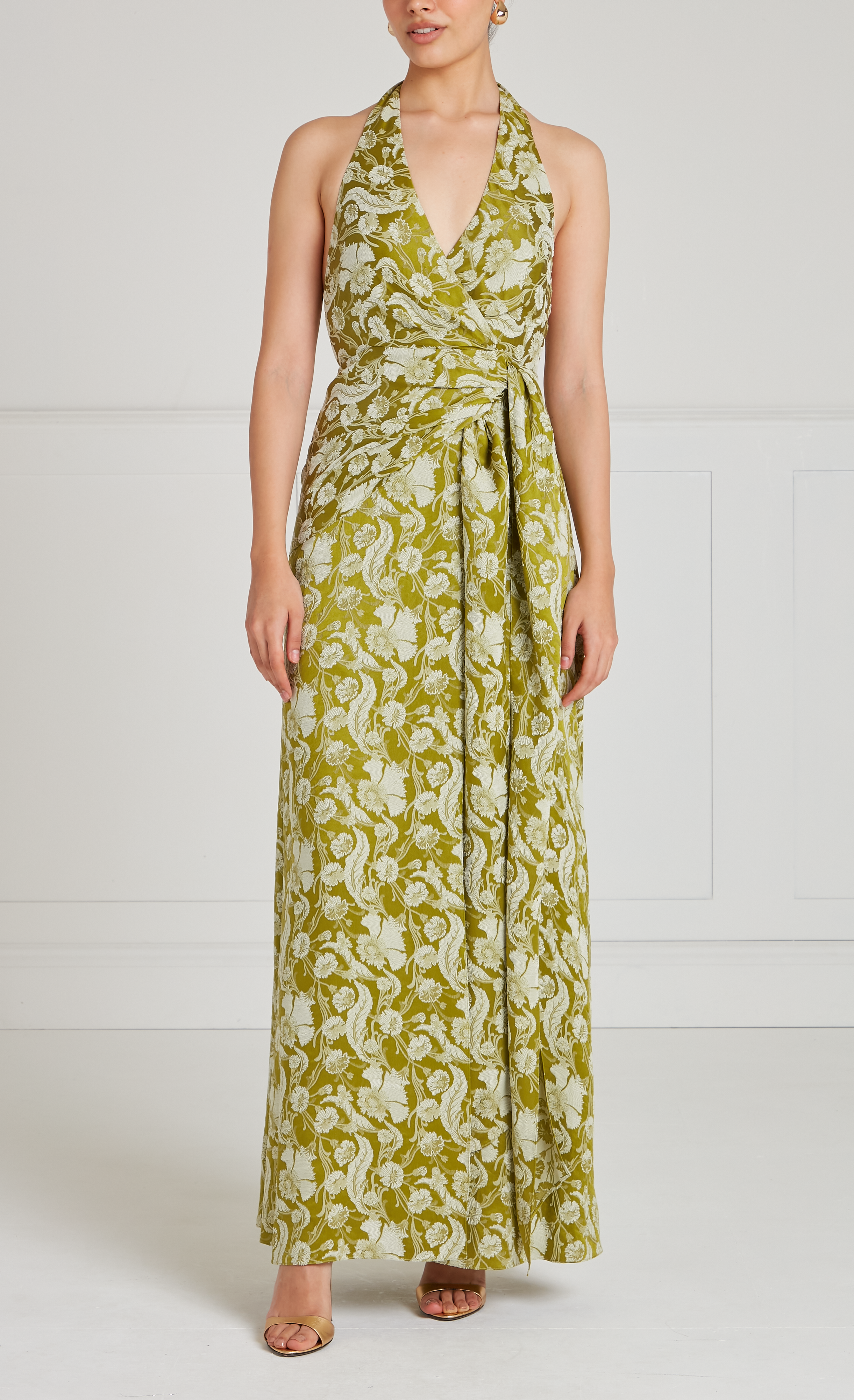 Designed with a deep V-neckline, open back, combined with a floor-length skirt with a front slit for movement. Finished with a softly draped tie at the hip, the silhouette can be adjusted and styled by the wearer for an effortlessly elegant finish.