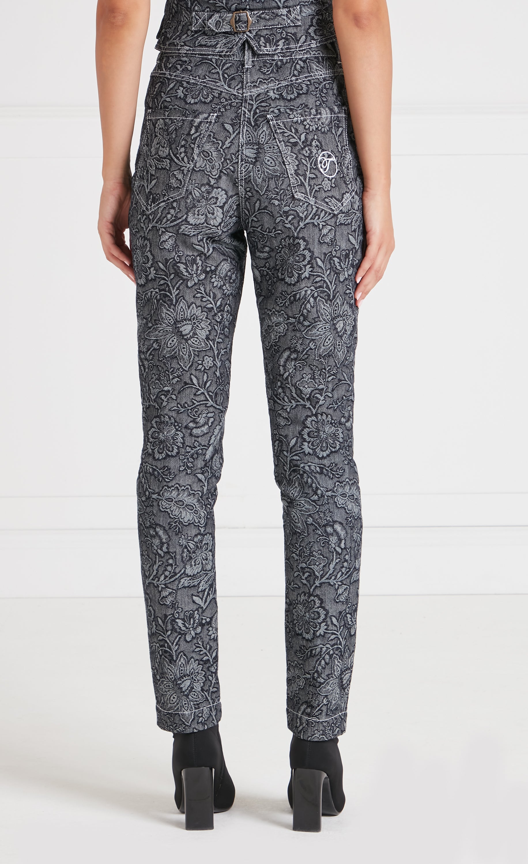 A modern wardrobe jean staple elevated through intricate craftsmanship. The Francis Denim Trousers feature a high-rise, slim-leg creating a sleek, elongated silhouette. Cut from textured jacquard denim featuring the signature floral motif, these jeans transition effortlessly from casual styling to evening sophistication.