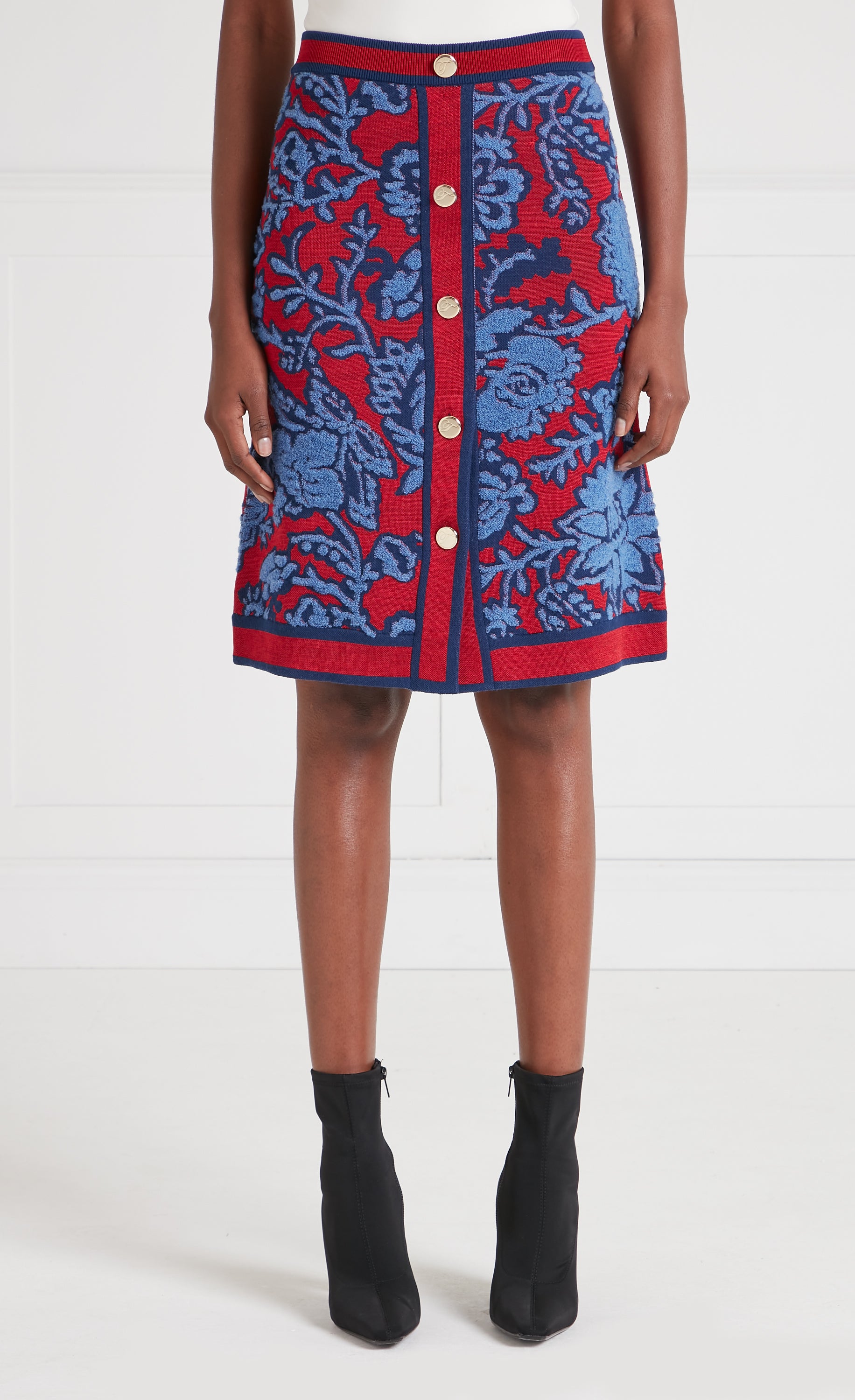 A flattering A-line skirt crafted in the Francis floral jacquard, defined by bold contrast trims and a front button closure. Its clean lines and textured knit make it a standout piece, equally suited for statement dressing or coordinated styling.