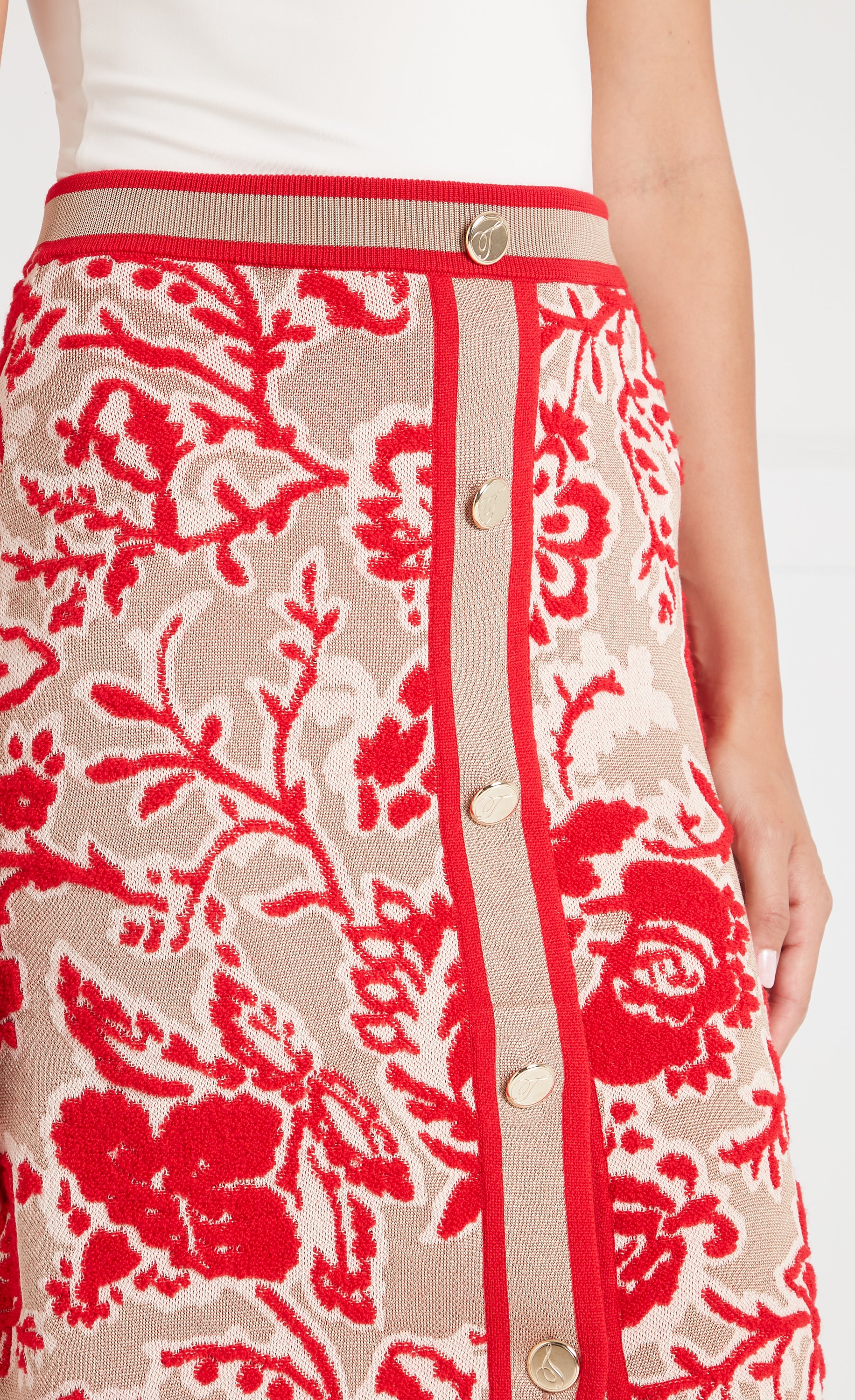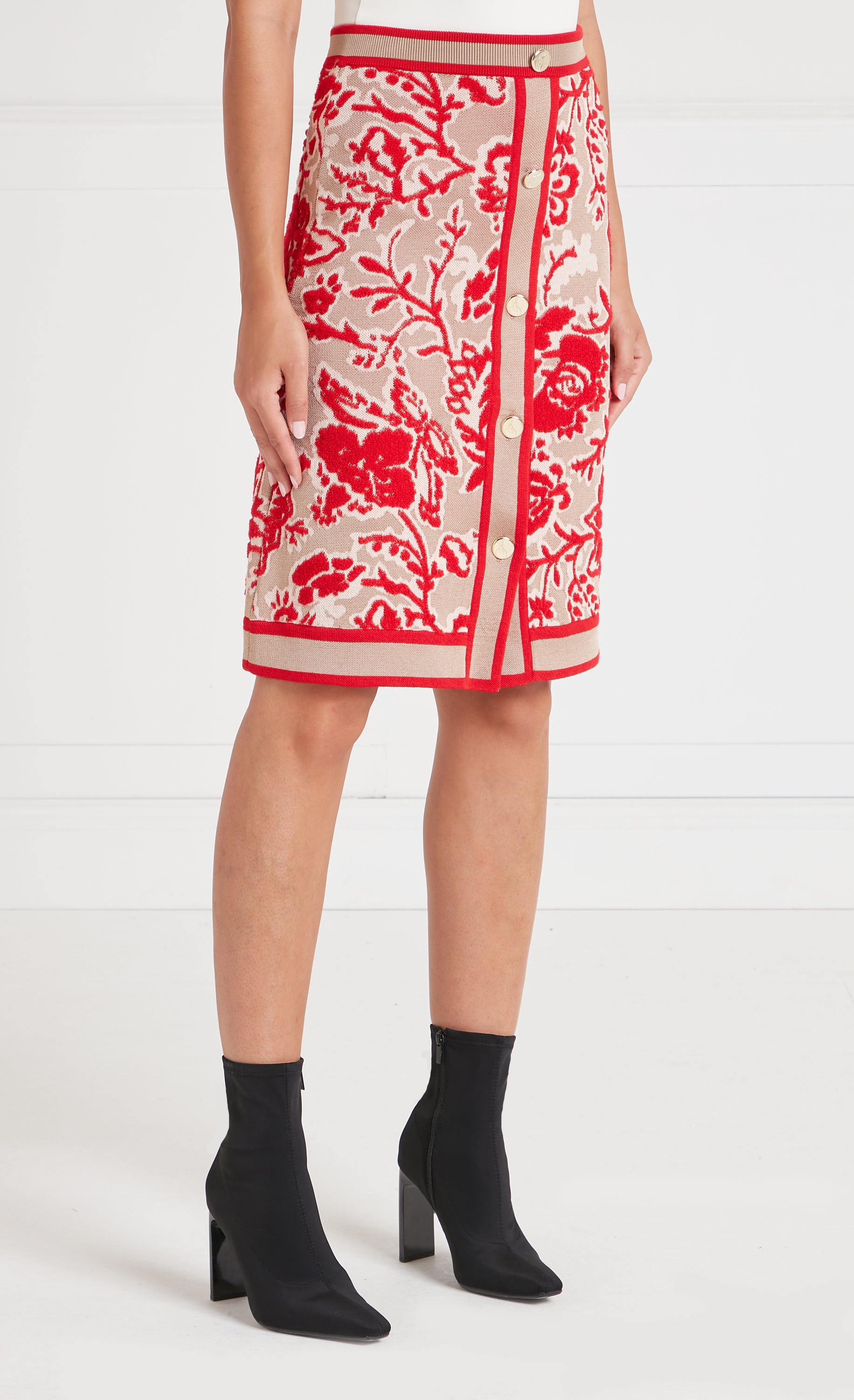 A flattering A-line skirt crafted in the Francis floral jacquard, defined by bold contrast trims and a front button closure. Its clean lines and textured knit make it a standout piece, equally suited for statement dressing or coordinated styling.