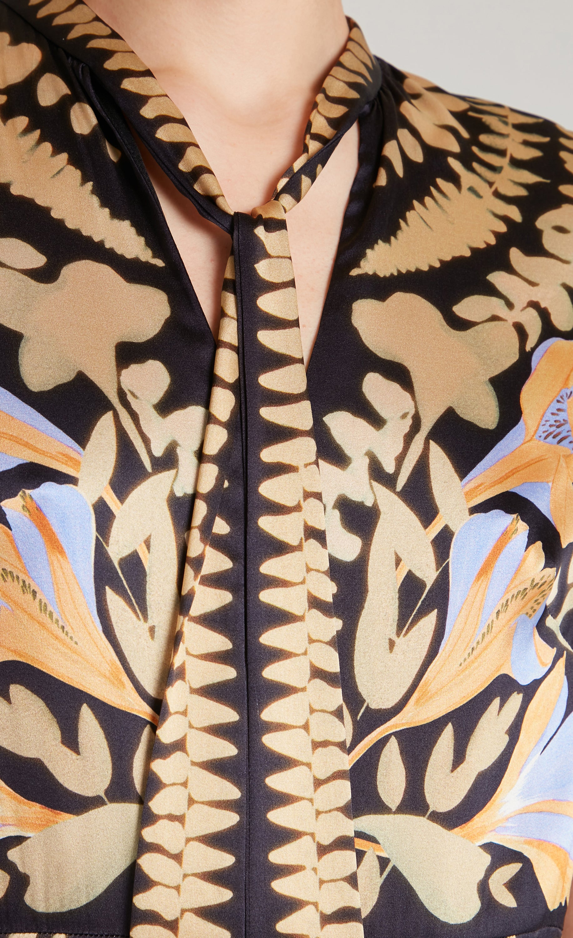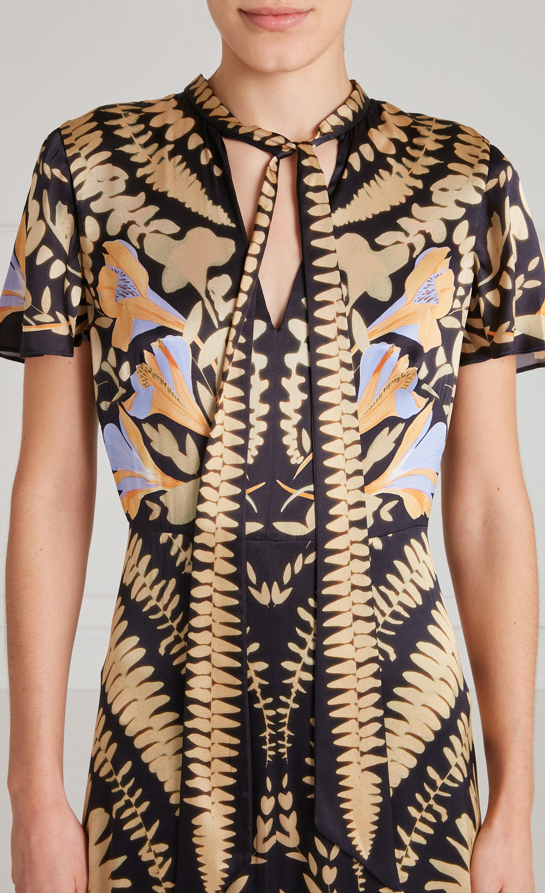 Effortlessly feminine, this full-length gown is cut from an Italian printed fluid silk satin to create a flattering, figure-skimming silhouette. Featuring an elegant tie detailing the V-neckline, a softly fitted bodice and a full length skirt with a front split for ease of movement.