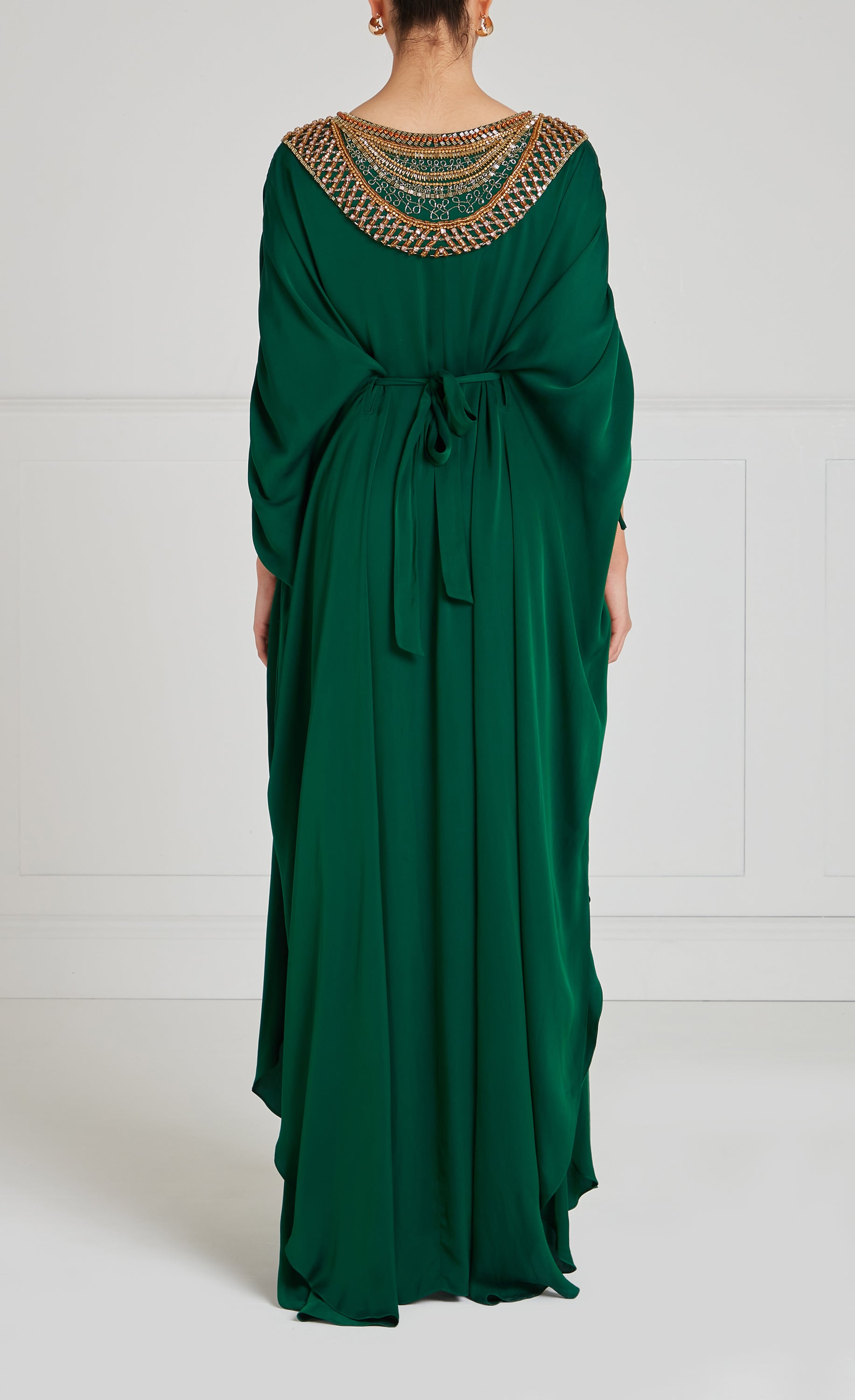 An empire waist and ruched sleeves create an elegantly relaxed fit on this full-length green dress. A modest V-neck features intricate gold sequin detailing, giving... More.