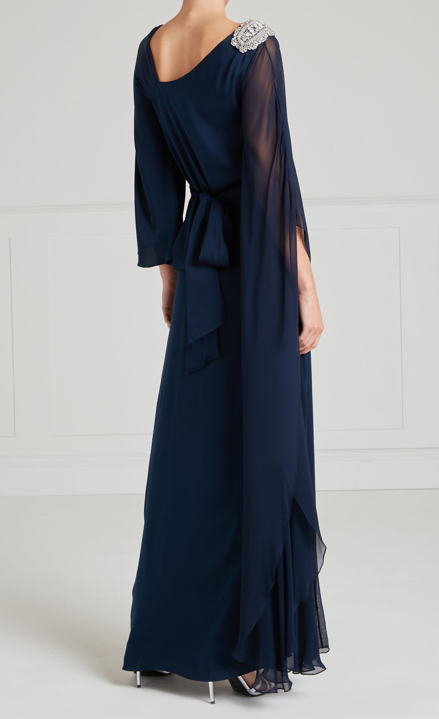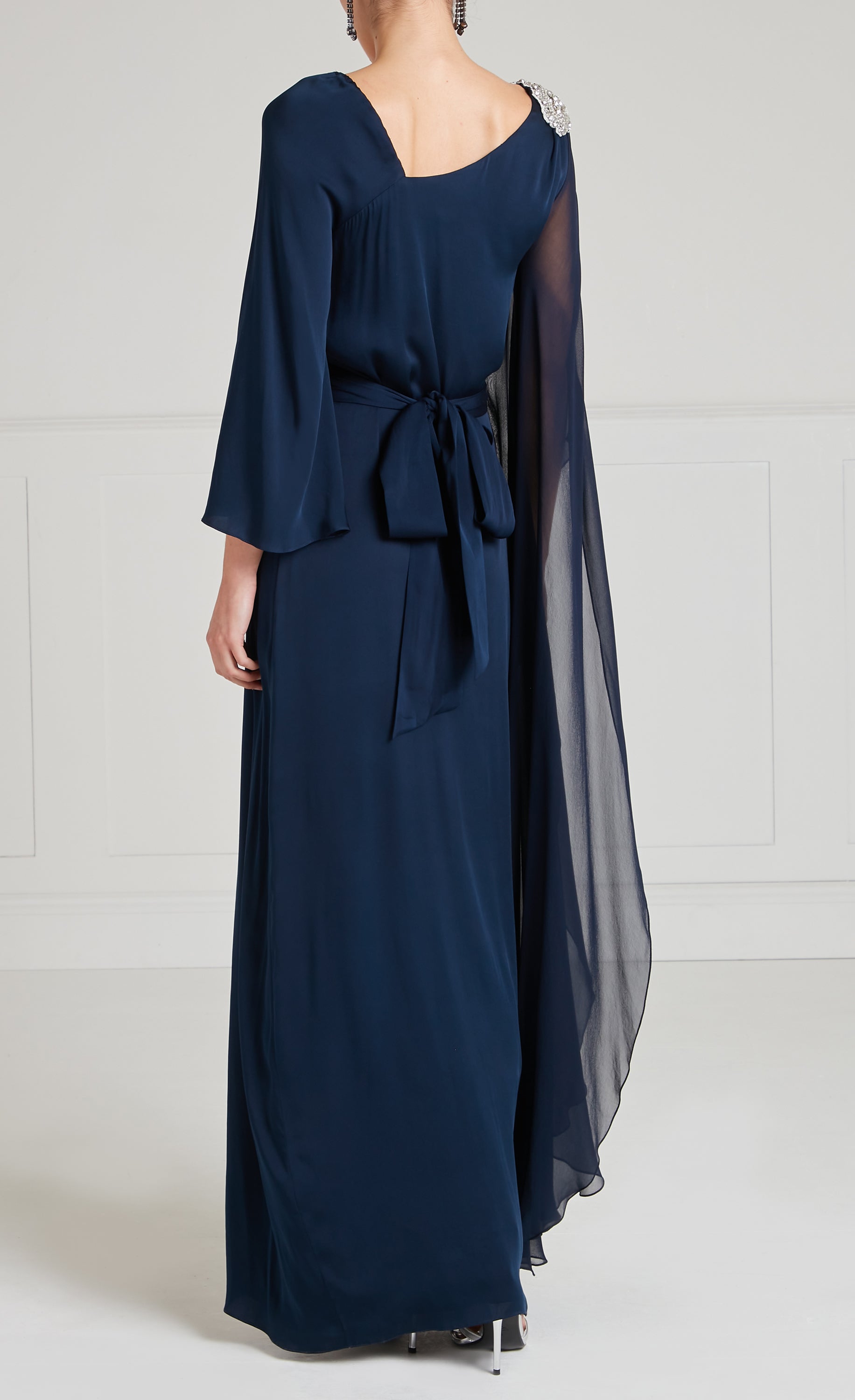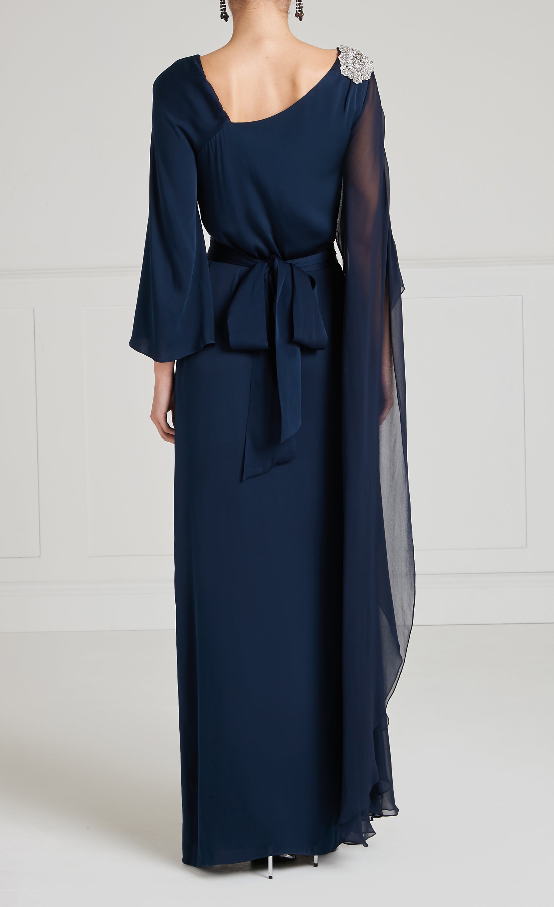 With an asymmetric, modest neckline, this navy blue dress falls elegantly to floor length and gleams with hand-crafted silver accents. A semi-sheer sleeve drapes from... More.