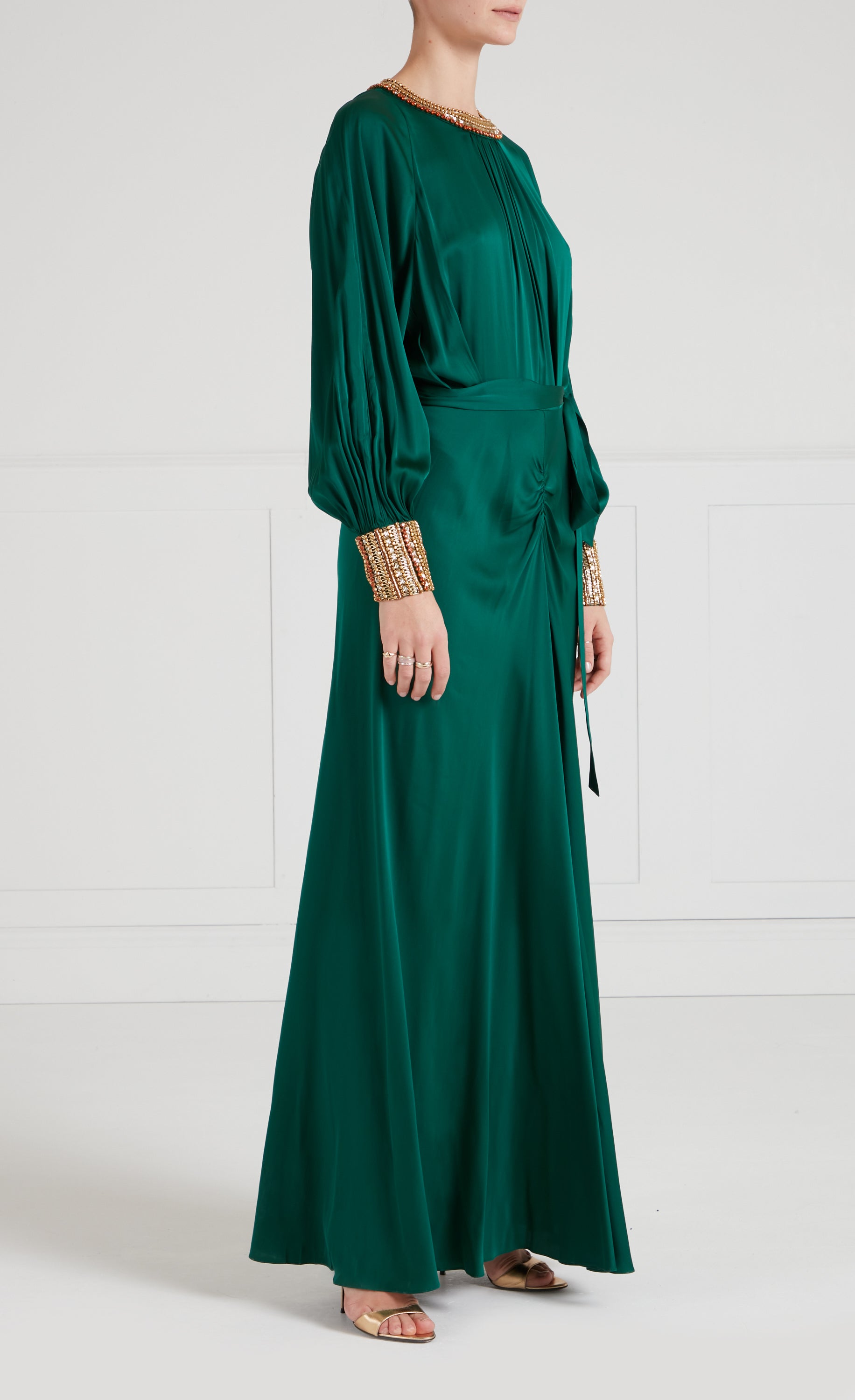 This striking green blouson gown is draped in a relaxed yet elegant silhouette, elevated by gold embellishment. Semi-sheer sleeves billow into sequin cuffs, while the... More.