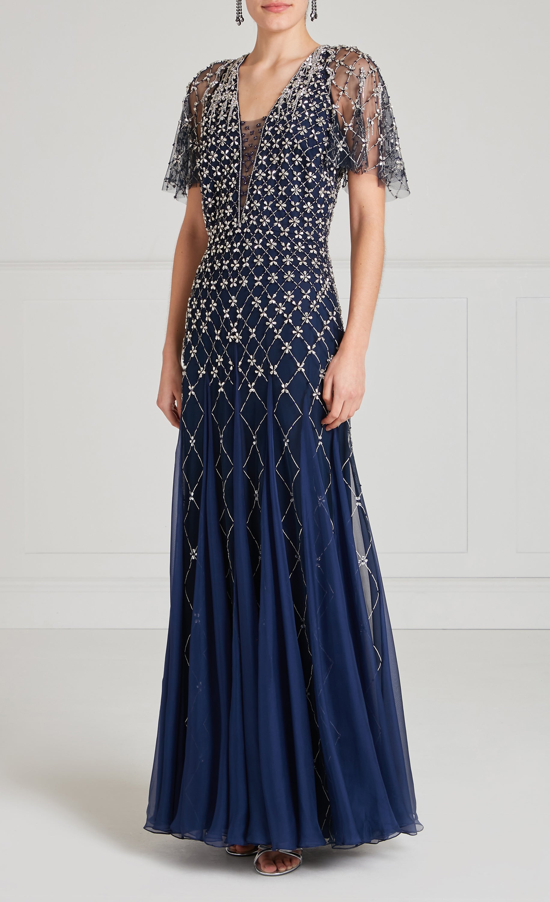 Strategically panelled tulle gives this dark blue floor-length gown a dramatic flair, accentuated by all-over silver embellishments. The silver-trimmed V-neck is modestly lined, while lattice... More.
